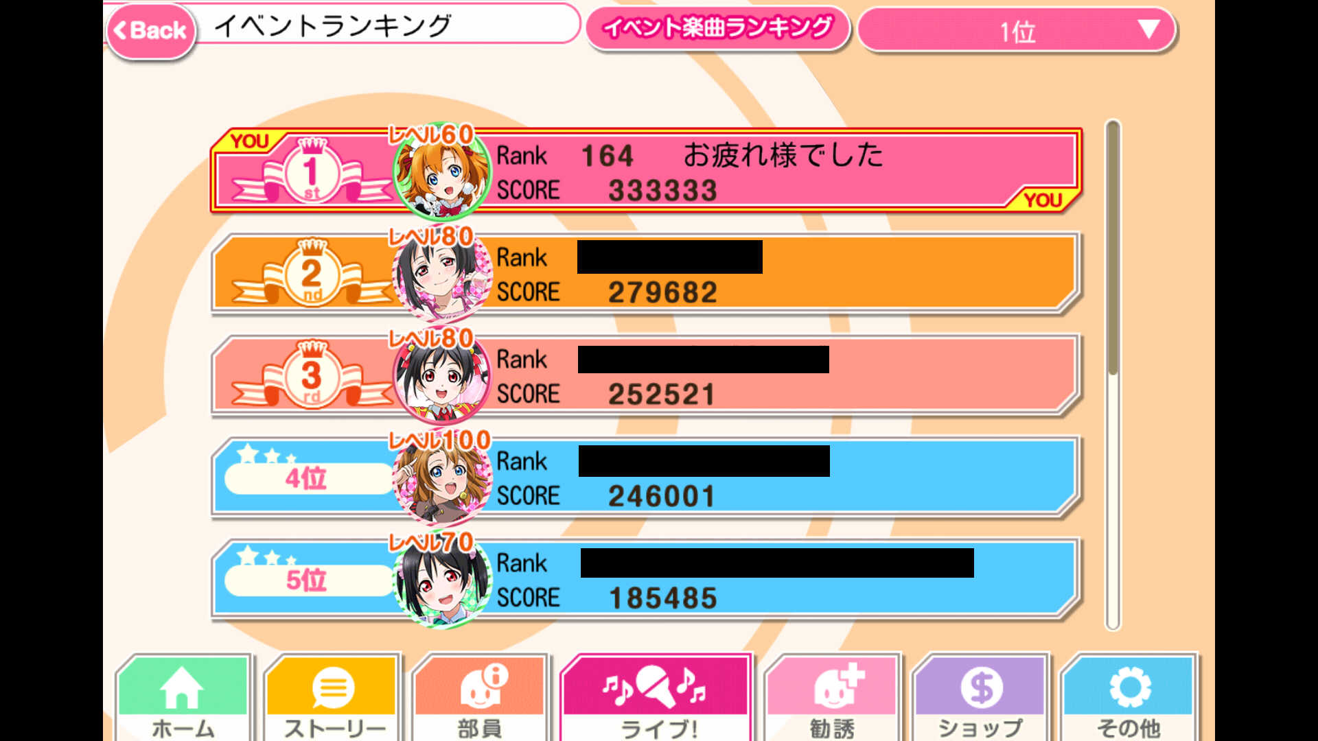 海未イベ77777pt9位の242501点485位。運良くUR引けたのが幸いしました。